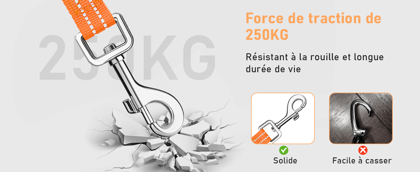 - 【Heavy Duty Hooks】Our hooks are made of zinc alloy, a high quality metal material, ensuring that our hooks can withstand a pulling force of 250kg. The surface of the hook is nickel-plated, which has the advantage of rust and corrosion resistance, smooth and not wear out. The hook can be rotated 360° to prevent the dog lanyard from getting tangled. Just press to connect the dog’s collar or chest strap.